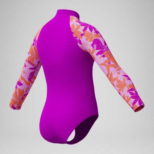 Prepara a tu pequeña para la diversión bajo el sol con este traje de baño de manga larga. Diseñado pensando en la protección y el estilo, ofrece una cobertura amplia en brazos, pecho y espalda, ideal para largas jornadas dentro y fuera del agua. El práctico cierre frontal hace que ponérselo y quitárselo sea muy sencillo, incluso cuando está mojado.