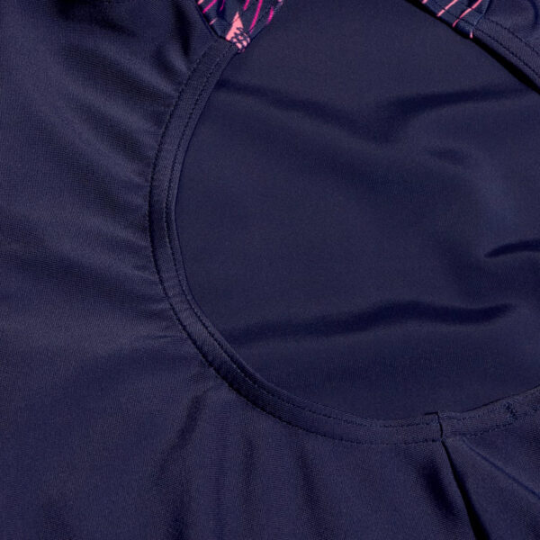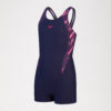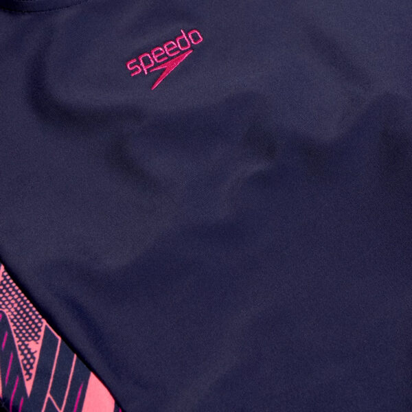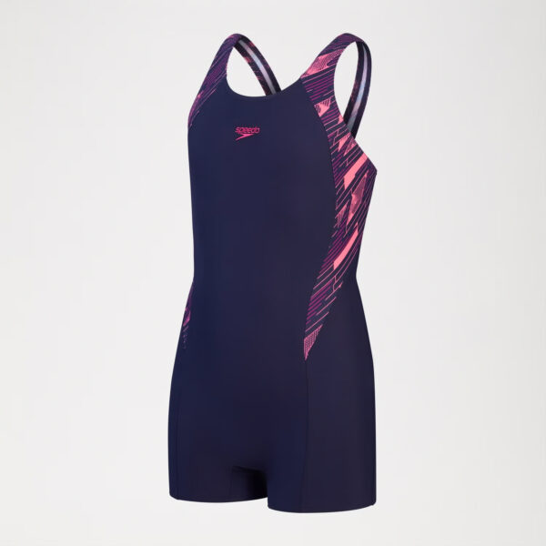Estilo icónico de Speedo. Este traje deportivo azul marino tiene una apariencia estilizada y presenta un empalme curvo de nuestro gráfico evolutivo HyperBoom en tonos contrastantes de rosa. Ideal para sesiones de natación más largas, el estilo Muscleback del Legsuit le permite a su hijo lograr un rango completo de movimiento durante la natación, mientras que el estilo Legsuit ofrece una mayor cobertura. Confeccionado con tejido EnduraFlex, ofrece mayor resistencia al cloro que los tejidos de trajes de baño estándar y se adapta como nuevo durante más tiempo con CREORA® HighClo™. Además, los hilos de nailon del tejido EnduraFlex están hechos 100% de residuos preconsumo, como residuos de tela de las fábricas.