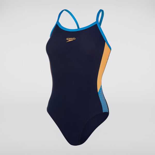 El traje de baño Dive Thinstrap Muscleback de Speedo cuenta con un llamativo panel lateral de bloque de color azul y naranja y es una opción perfecta para su entrenamiento. El diseño musculoso con correas delgadas garantiza que tenga la flexibilidad que necesita al nadar con la libertad de moverse cómodamente sin restricciones. El tejido Endurance10 que conserva la forma es 100% resistente al cloro y de secado rápido, lo que le proporciona un traje de baño duradero que se puede usar regularmente.