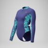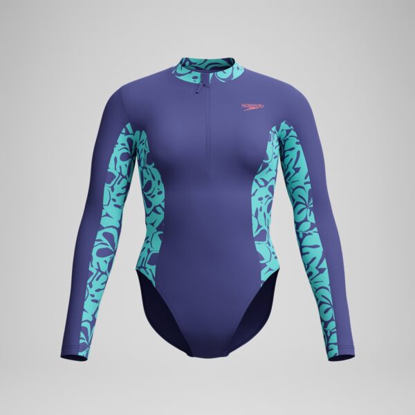 Escapar el 9-5 con nuestro traje de baño de manga larga con exóticos paneles de estampado de flores. Hecho para aventuras en la playa, incluye una cremallera delantera para un fácil cambio. Un clásico forro de botes proporciona soporte. Corte de tejido de secado rápido, resistente al cloro.