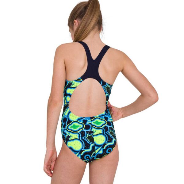 Lleva su entrenamiento a otro nivel con estampados inspirados en la galaxia. Diviértete en la piscina con este traje de baño renovado que presenta un estampado de planetas giratorios. Con un ajuste mejorado, el estilo Splashback cuenta con tirantes gruesos, posicionados para permitir un rango completo de movimiento, para que las jóvenes nadadoras puedan moverse libremente durante el entrenamiento. Ideal para entrenamientos y competencias de natación, está fabricado con nuestro tejido Endurance+ ultra duradero y 100% resistente al cloro.