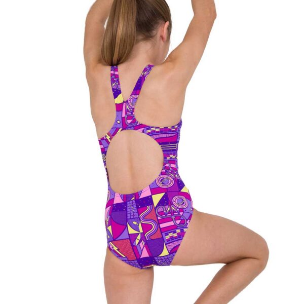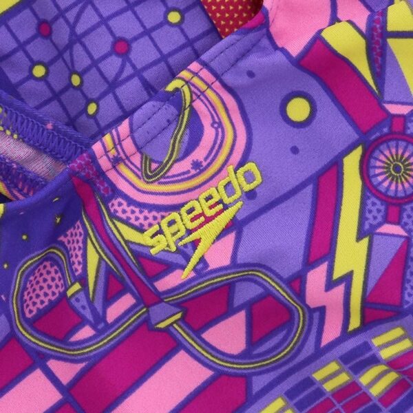 Destaca con gráficos y colores inspirados en el estilo retro. Trae diversión a la piscina con este colorido traje de baño que presenta formas llamativas en una paleta de morados, rosas y amarillos. El estilo Splashback cuenta con tirantes gruesos, posicionados para permitir un rango completo de movimiento, haciendo que las jóvenes nadadoras se sientan cómodas y libres para moverse. Ideal para entrenamientos de natación y competencias, está hecho de tejido Endurance+ súper duradero y 100% resistente al cloro.